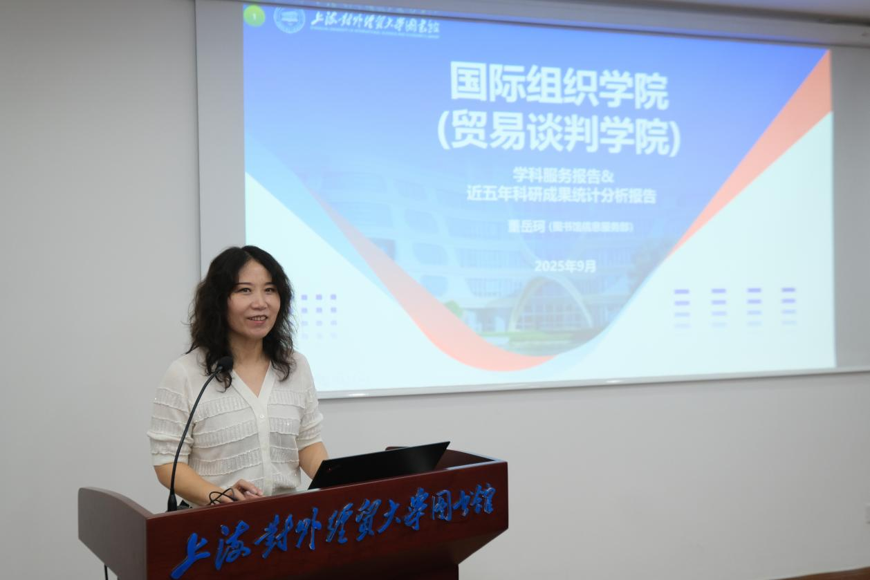 图书馆副馆长谢蓉介绍了《国际组织学院(贸易谈判学院)学科服务报告》《国际组织学院(贸易谈判学院)近五年科研成果统计分析报告》《数字资源手册》完成的相关背景和主要特点,及相关学科服务工作开展的整体情况。信息服务部主任董岳珂围绕学科服务报告、近五年科研成果分析报告的编制特点和主要内容及与学院相关的数字资源,进行了演示和介绍。图书馆学科服务团队聚焦国际组织学院及其前身WTO研究教育学院科研学术成果,历时数月,利用中外文权威检索平台和分析工具,收集整理了学院科研成果,聚焦不同职称群体开展学术成果分析与揭示,发布两份报告,帮助学院摸清成果家底,深入了解教师的贡献度和学术影响力,聚焦学院核心竞争力发力,助力学院学科发展再上新台阶。