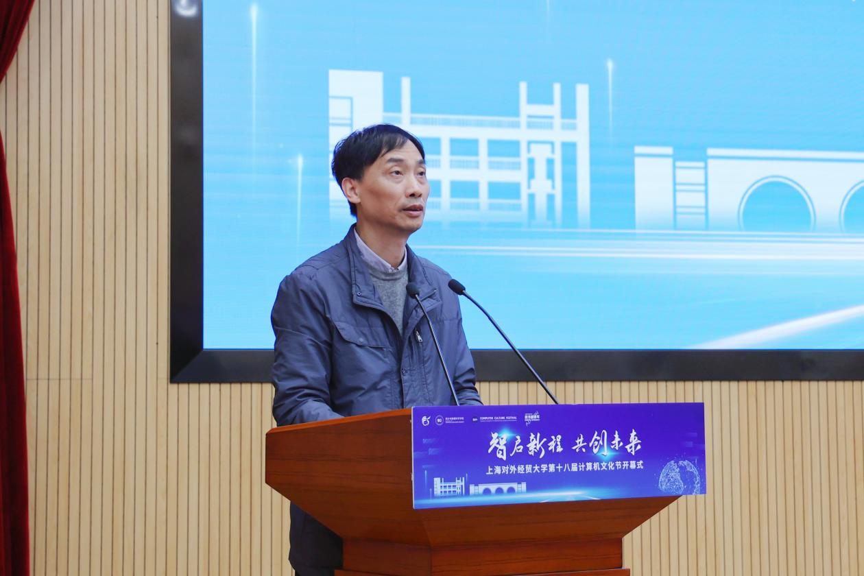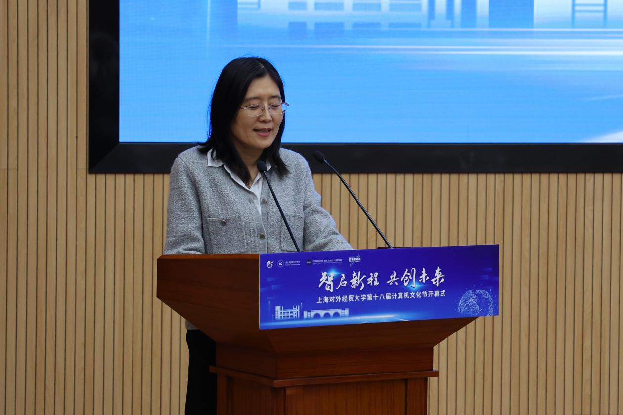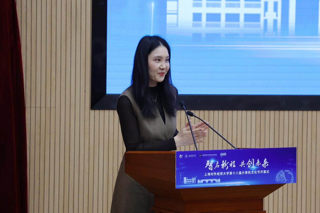 1030日中午,“智启新程,共创未来”上海对外经贸大学第十八届计算机文化节开幕式在松江校区图书馆思源报告厅举行。上海对外经贸大学副校长姜秀珍,统计与数据科学学院党委书记黄静,党委宣传部副部长张帅,教务处副处长李医群,党委学工部副部长、学生处副处长陈雪,团委书记司徒力云以及全校300余名师生代表共同参加开幕式。